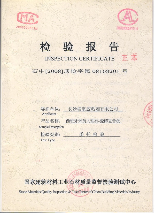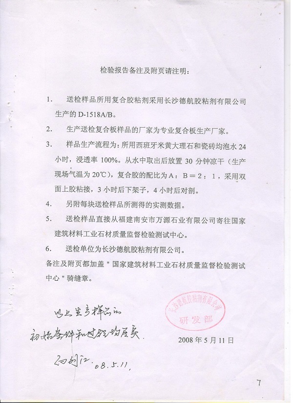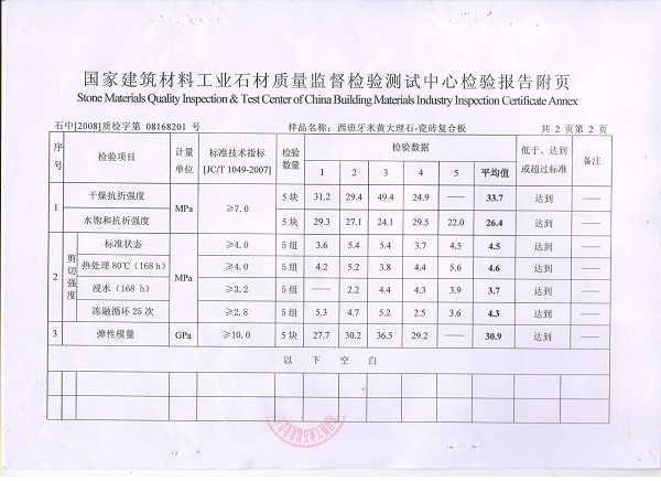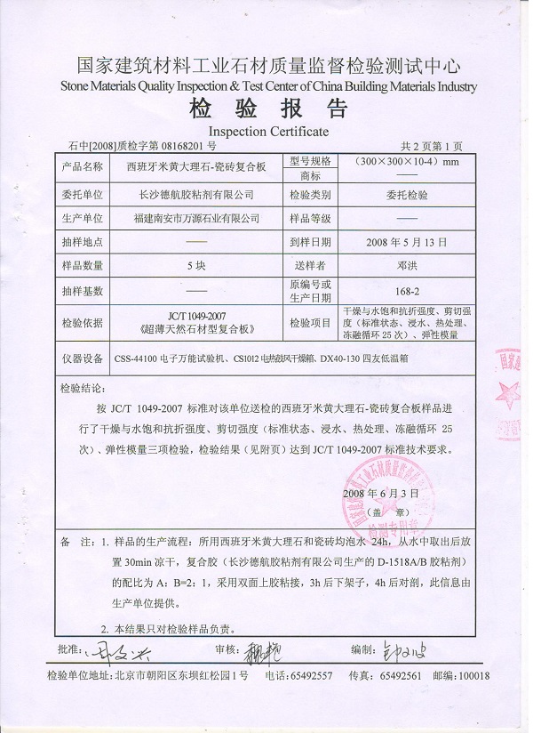 3、按照JC/T1049-2007《超薄天然型石材復合板》標準進行檢測。國家建筑材料石材質量監(jiān)督檢驗測試中心檢測結果于下: